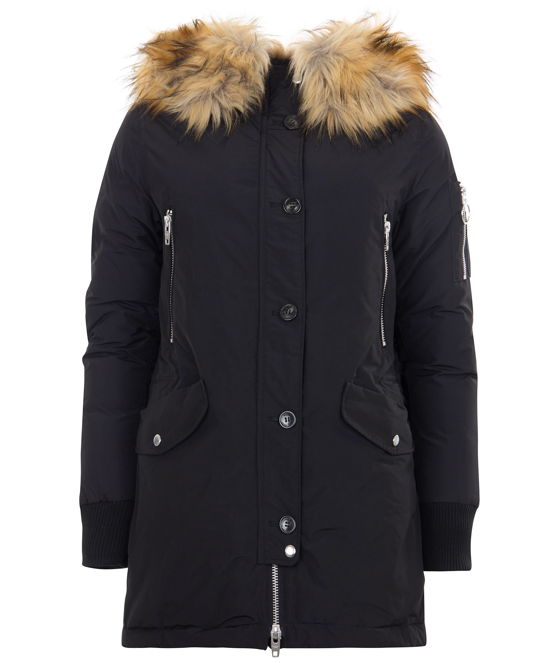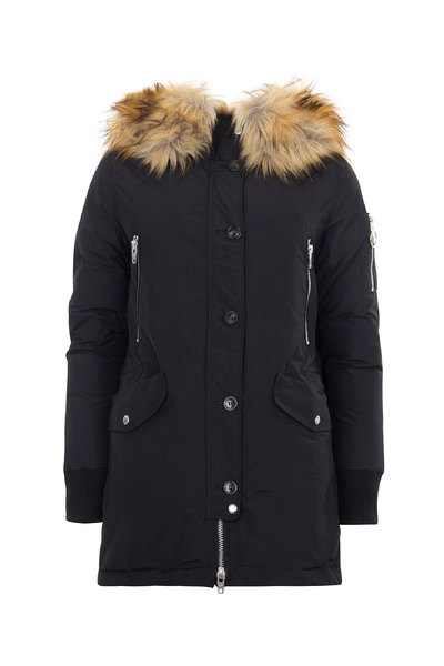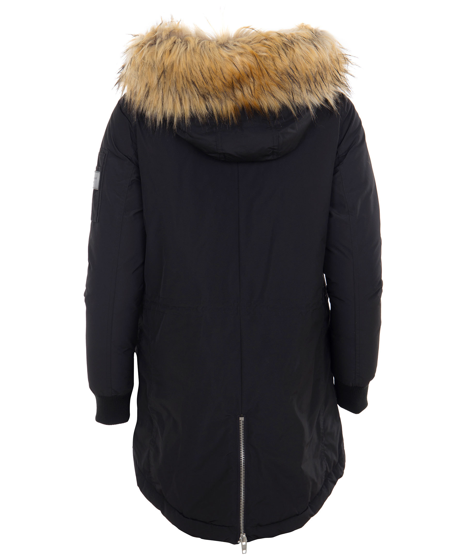 Dunjacka i parkas-stil med avtagbar huva och löstagbar äkta pälskant. Damjackan har två fickor med ficklock, två dolda fickor och två bröstfickor med dragkedja. Fram stängs jackan med en tvåvägsdragkedja och en knappslå med knappar. Dold dragsko i midjan.